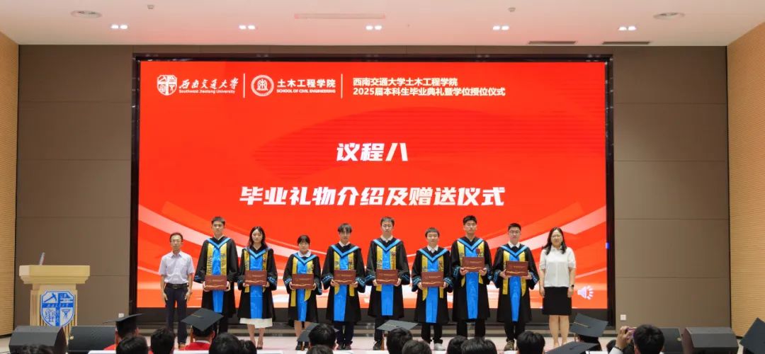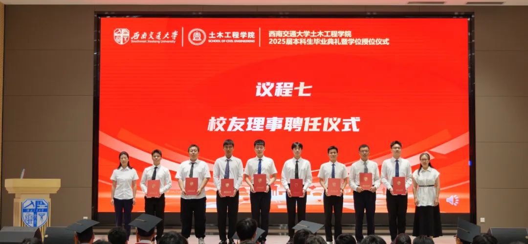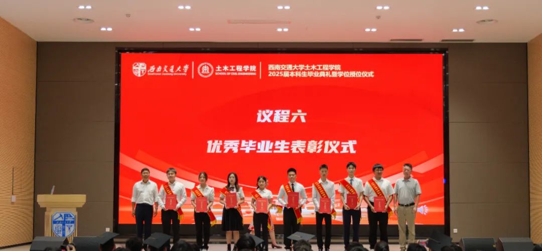 六月盛夏,骊歌奏响。6月21日下午,土木工程学院2025届本科生毕业典礼暨学位授予仪式在犀浦校区“双一流”会议中心顺利召开。土木工程学院院长蒲黔辉、党委书记郑江、副院长陈嵘、党委副书记兼副院长车小洁、副院长徐腾飞、副院长于丽、道路与铁道工程系主任杨荣山、地下工程系主任方勇、岩土工程系主任杨涛、陆地交通灾害防治技术研究中心执行主任庄卫林、建筑工程系副主任刘艳辉、结构力学教研室主任蔡婧、图学及BIM研究所副主任赵莉香、21级班导师代表王志杰、金虎、教师代表徐井芒、学院综合事务办公室主任黄雪娇、学工组副组长张进出席毕业典礼,全体辅导员及毕业生家长共同见证这一意义非凡的时刻。典礼由学院党委副书记刘萍主持。