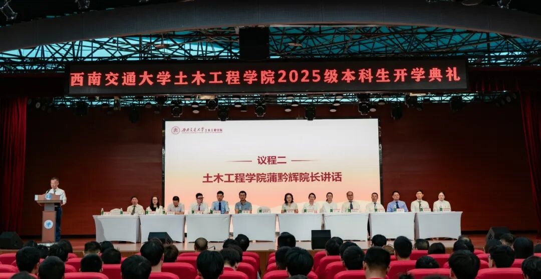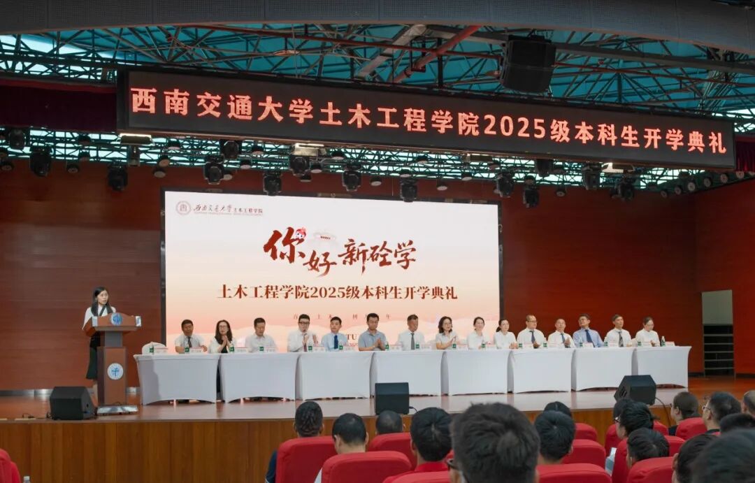秋风吹拂,岁月如诗。为庆祝土木工程学院679名来自五湖四海的新生跨越山河,汇聚交大,9月8日晚,西南交通大学土木工程学院在犀浦校区大学生活动中心隆重举行了土木工程学院2025级本科生开学典礼。土木工程学院院长蒲黔辉,党委书记郑江,副院长陈嵘,党委副书记兼副院长车小洁,副院长徐腾飞、于丽,教学主管郭瑞,道路与铁道工程系主任杨荣山,桥梁工程系主任李永乐,岩土工程系主任杨涛,建筑工程系副主任刘艳辉,地下工程系副主任蒋雅君,陆地交通灾害防治技术研究中心执行主任庄卫林,流体力学教研室主任杨庆华,图学及BIM研究所副主任赵莉香出席典礼,学院专业老师、2025级本科班导师、全体辅导员们共同到场观礼。典礼由党委副书记刘萍主持。