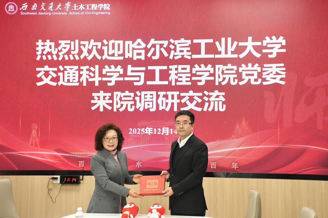 12月14日上午,哈尔滨工业大学交通科学与工程学院党委书记王东升一行,到西南交通大学土木工程学院进行调研交流。调研座谈会在九里校区土木工程学院会议室举行,会议由学院党委委员、副院长陈嵘主持。