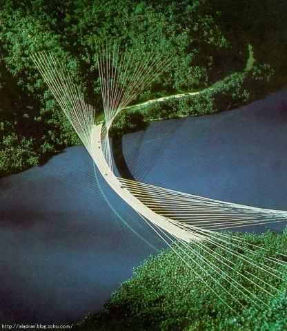 1) 采用众多钢拉索组成空间双曲面索面,四个索面的拉力代替了桥梁墩台,承载了整个桥梁的荷载,全桥没有一个桥墩。